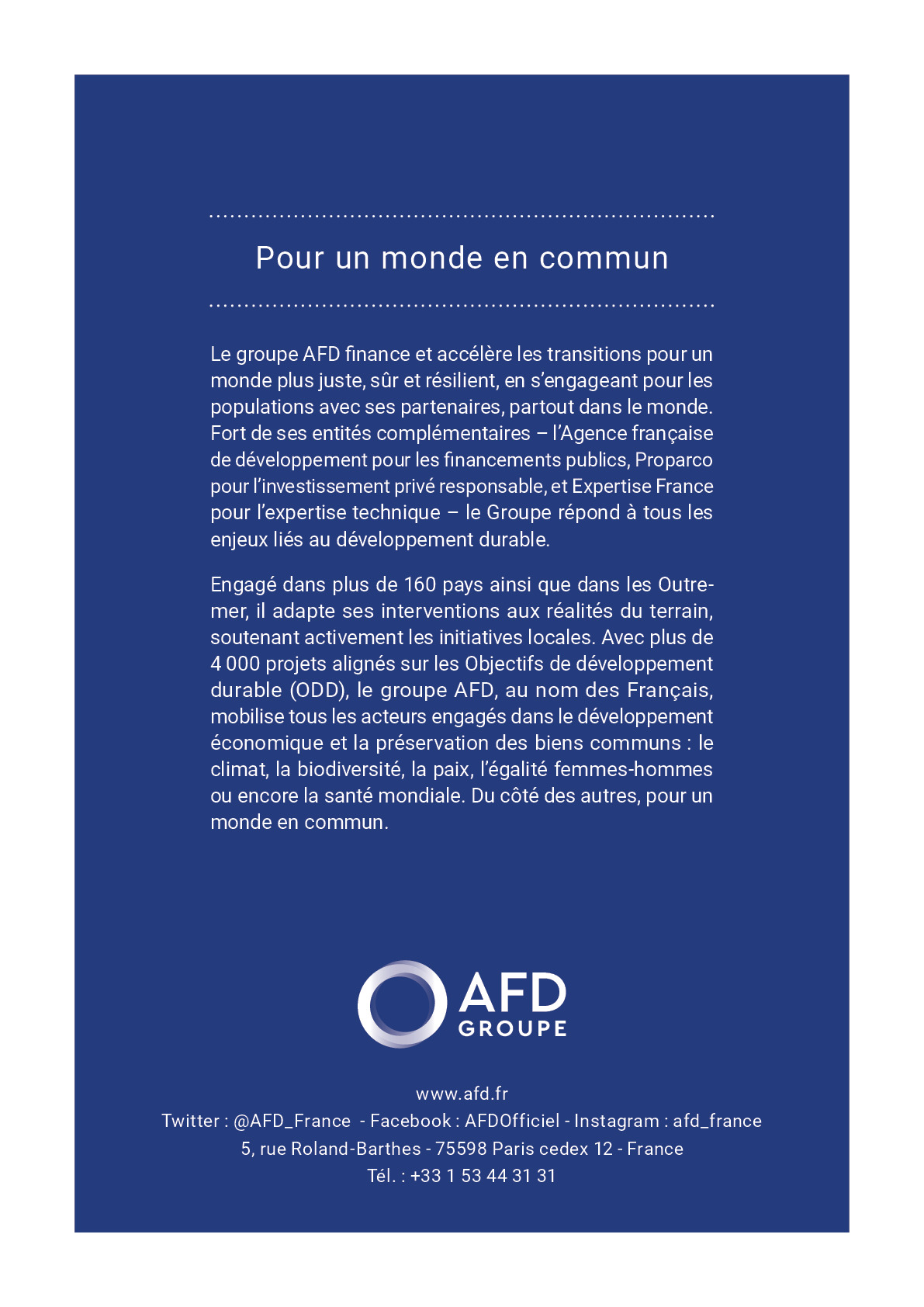Le groupe AFD finance et accélère les transitions pour un monde plus juste, sûr et résilient, en s'engageant pour les populations avec ses partenaires, partout dans le monde. Fort de ses entités complémentaires - l'Agence française de développement pour les financements publics, Proparco pour l'investissement privé responsable, et Expertise France pour l'expertise technique - le Groupe répond à tous les enjeux liés au développement durable. Engagé dans plus de 160 pays ainsi que dans les Outre- mer, il adapte ses interventions aux réalités du terrain, soutenant activement les initiatives locales. Avec plus de 4 000 projets alignés sur les Objectifs de développement durable (ODD), le groupe AFD, au nom des Français, mobilise tous les acteurs engagés dans le développement économique et la préservation des biens communs : le climat, la biodiversité, la paix, l'égalité femmes-hommes ou encore la santé mondiale. Du côté des autres, pour un monde en commun. Le groupe AFD finance et accélère les transitions pour un monde plus juste, sûr et résilient, en s'engageant pour les populations avec ses partenaires, partout dans le monde. Fort de ses entités complémentaires - l'Agence française de développement pour les financements publics, Proparco pour l'investissement privé responsable, et Expertise France pour l'expertise technique - le Groupe répond à tous les enjeux liés au développement durable. Engagé dans plus de 160 pays ainsi que dans les Outre-mer, il adapte ses interventions aux réalités du terrain, soutenant activement les initiatives locales. Avec plus de 4 000 projets alignés sur les Objectifs de développement durable (ODD), le groupe AFD, au nom des Français, mobilise tous les acteurs engagés dans le développement économique et la préservation des biens communs : le climat, la biodiversité, la paix, l'égalité femmes-hommes ou encore la santé mondiale. Du côté des autres, pour un monde en commun.