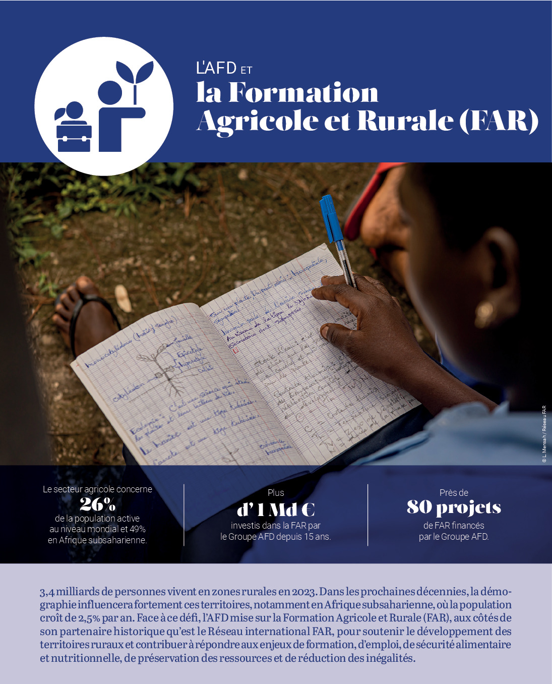 3,4 milliards de personnes vivent en zones rurales en 2023. Dans les prochaines décennies, la démo- graphie influencera fortement ces territoires, notamment en Afrique subsaharienne, où la population croît de 2,5% par an. Face à ce défi, l'AFD mise sur la Formation Agricole et Rurale (FAR), aux côtés de son partenaire historique qu'est le Réseau international FAR, pour soutenir le développement des territoires ruraux et contribuer à répondre aux enjeux de formation, d'emploi, de sécurité alimentaire et nutritionnelle, de préservation des ressources et de réduction des inégalités. 3,4 milliards de personnes vivent dans des zones rurales en 2023. Dans les prochaines décennies, la démographie influencera fortement ces territoires, notamment en Afrique subsaharienne, où la population croît de 2,5 % par an. Face à ce défi, l'AFD mise sur la Formation Agricole et Rurale (FAR), en collaboration avec son partenaire historique, le Réseau international FAR, pour soutenir le développement des territoires ruraux et contribuer à répondre aux enjeux de formation, d'emploi, de sécurité alimentaire et nutritionnelle, de préservation des ressources et de réduction des inégalités.
