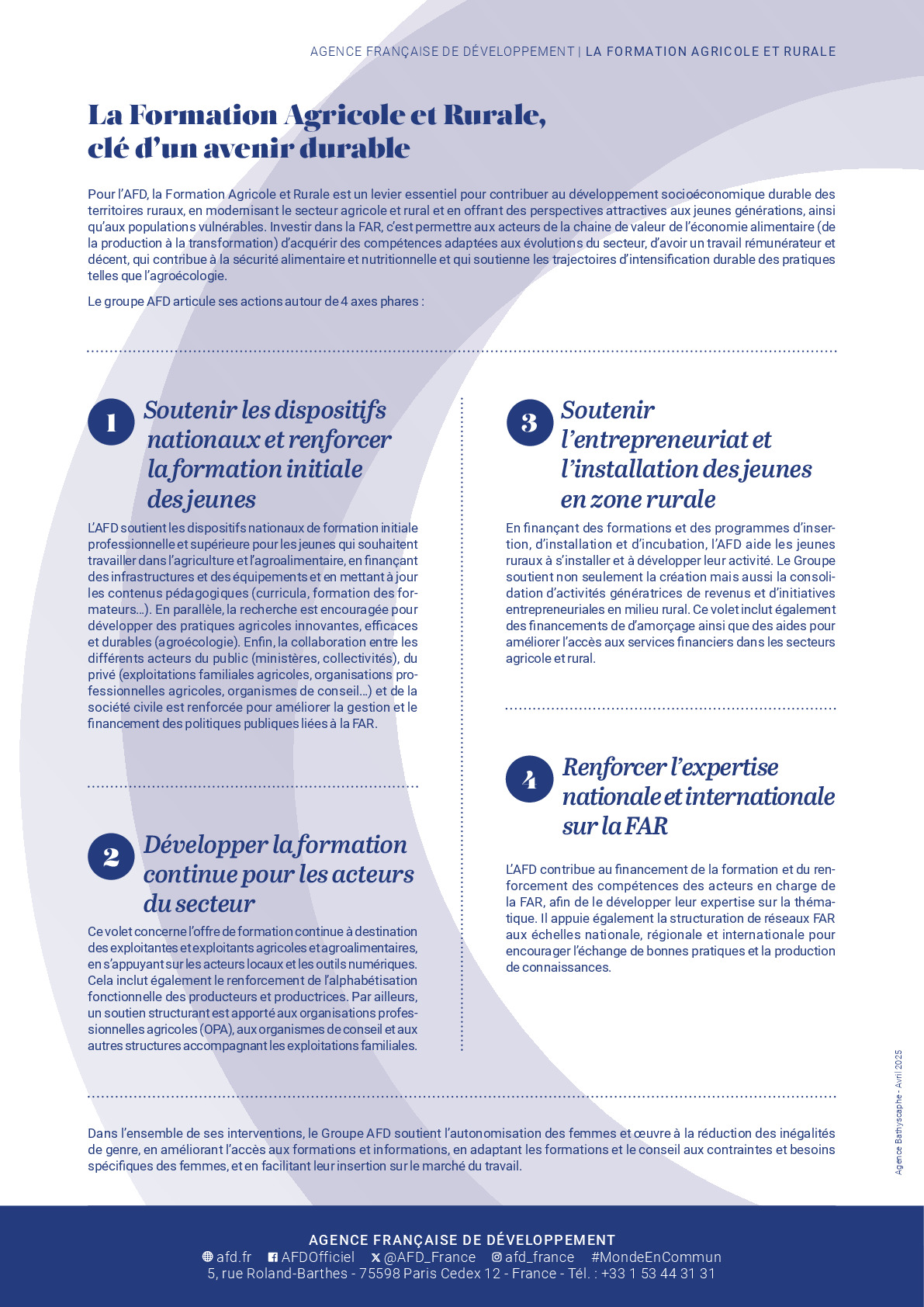 Pour l'AFD, la Formation Agricole et Rurale est un levier essentiel pour contribuer au développement socioéconomique durable des territoires ruraux, en modernisant le secteur agricole et rural et en offrant des perspectives attractives aux jeunes générations, ainsi qu'aux populations vulnérables. Investir dans la FAR, c'est permettre aux acteurs de la chaine de valeur de l'économie alimentaire (de la production à la transformation) d'acquérir des compétences adaptées aux évolutions du secteur, d'avoir un travail rémunération et décent, qui contribue à la sécurité alimentaire et nutritionnelle et qui soutienne les trajectoires d'intensification durable des pratiques telles que l'agroécologie. Le groupe AFD articule ses actions autour de 4 axes phares : Pour l'AFD, la Formation Agricole et Rurale est un levier essentiel pour contribuer au développement socioéconomique durable des territoires ruraux. Elle modernise le secteur agricole et rural tout en offrant des perspectives attractives aux jeunes générations et aux populations vulnérables. Investir dans la FAR permet aux acteurs de la chaîne de valeur de l'économie alimentaire — de la production à la transformation — d'acquérir des compétences adaptées aux évolutions du secteur. Cela garantit un emploi rémunérateur et décent, contribue à la sécurité alimentaire et nutritionnelle, et soutient les trajectoires d'intensification durable des pratiques telles que l'agroécologie. Le groupe AFD articule ses actions autour de quatre axes phares.